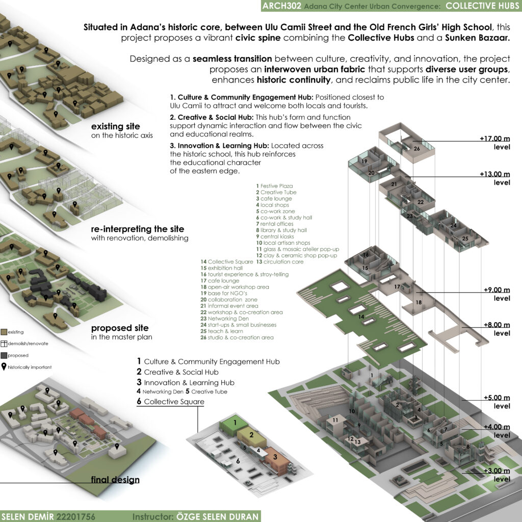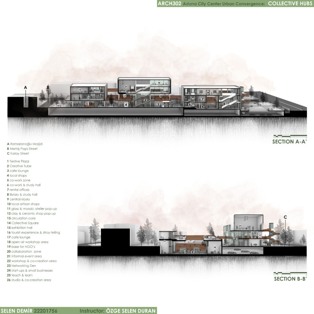 Located between Ulu Camii Street and the Old French Girls’ High School in Adana’s historic center, this project proposes a civic spine uniting three Collective Hubs with a Sunken Bazaar.