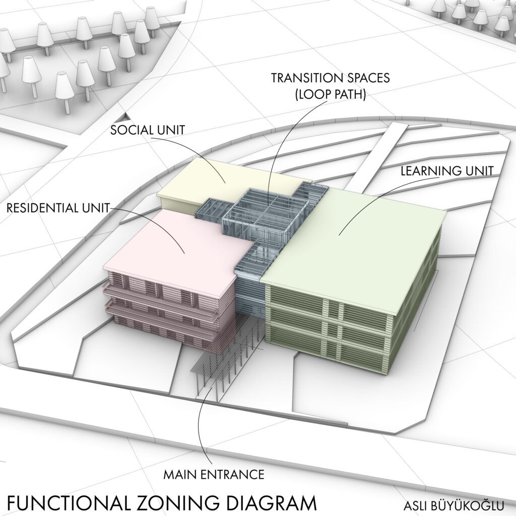The project “Via Vita” is a lifelong learning and elderly care center designed to encourage both youth and the elderly to engage in a life integrated with learning and socialization. Targeting elderly individuals with dementia, it emphasizes uninterrupted, accessible circulation based on the LOOP concept. The design centers around a colonnaded atrium that connects all units. The layout is defined by four key architectural units: residential, social, learning, and transition. Each unit interacts within and between based on levels of publicity. The central atrium defines the looped circulation while fostering social interaction between younger and older users.
