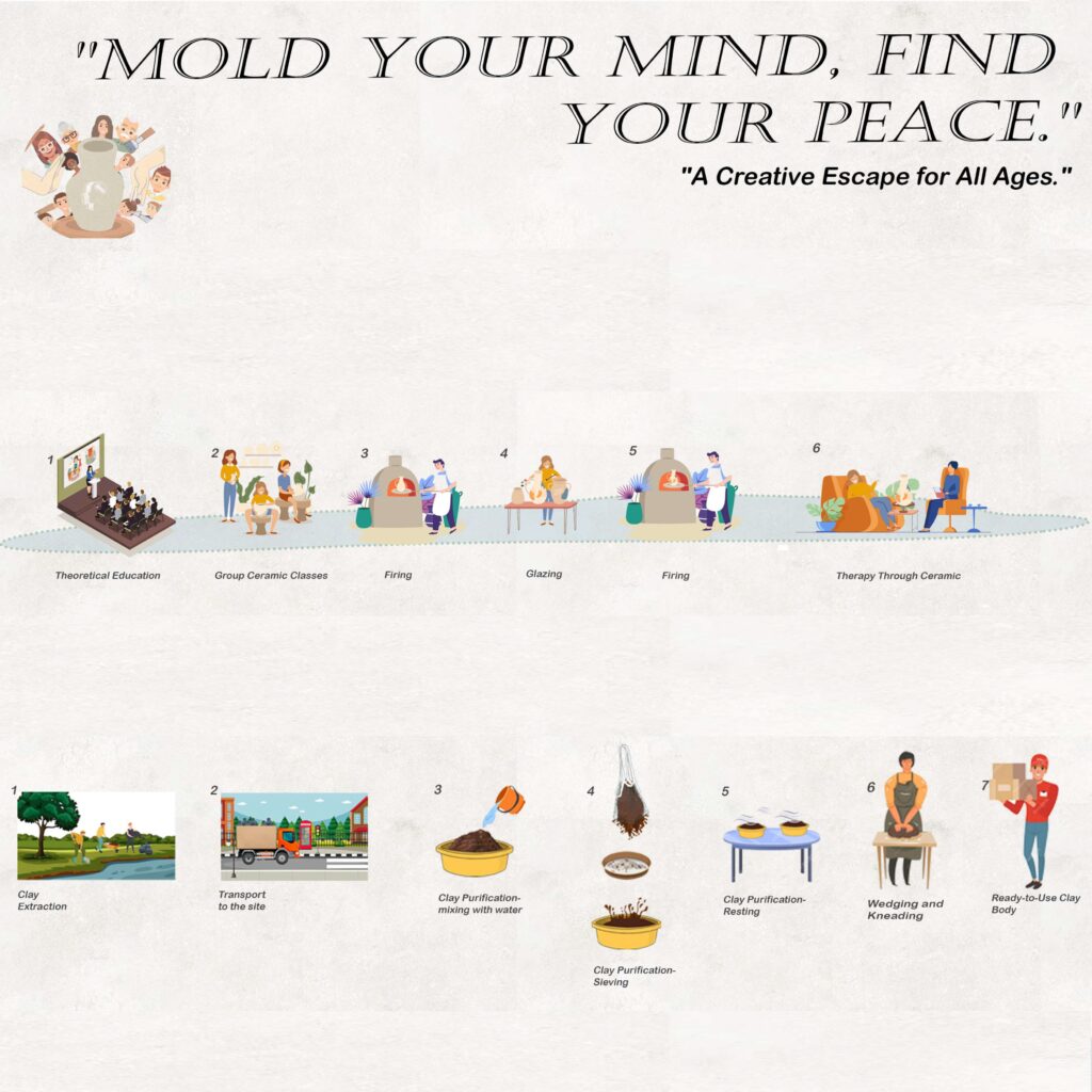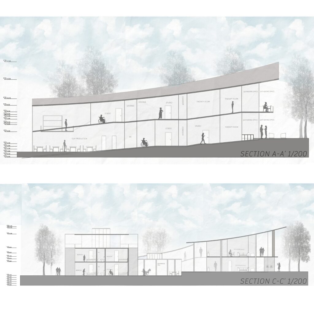 Therapy Through Art Center integrates craft and mental healing through clay. The process begins with raw clay collected from the nearby Çubuk River, which is then processed on site. After receiving theoretical education in the conference hall, visitors shape clay in ceramic studios. This experience supports emotional therapy and self-expression. Artworks are exhibited on openable panels placed on the façade, allowing people to view them both from inside and outside as they move through the center. In gathering spaces and the park, visitors can enjoy while observing these exhibitions, enhancing their connection with both the space and the creative expressions of others.