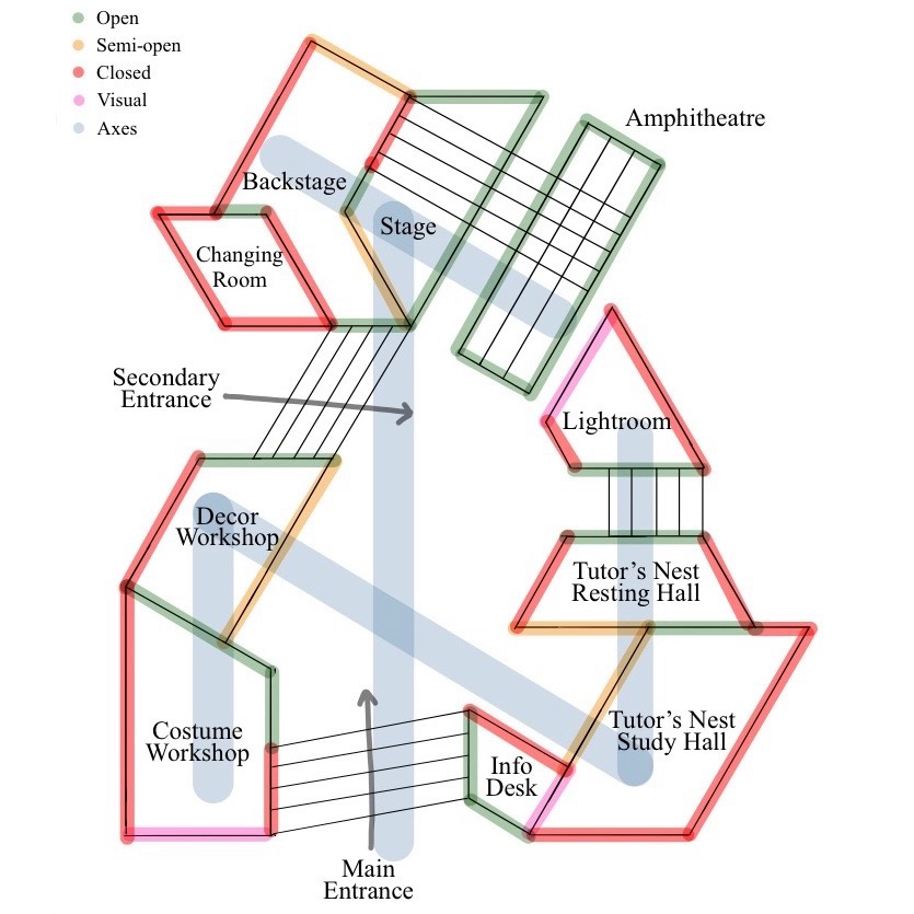The summer camp hosted by Bilkent Drama Atölyesi centers around the concept “The Unexpectedness of Improvisation”. This concept is reflected in the spatial experience through angular forms that have sharp turns allowing each corner to reveal an element of surprise for the visitors of the camp as they are walking around. The camp layout follows an axial organization that enables the formation of these sharp turns and these axes are defined by the linear elements. The proximity between open and closed spaces creates a sense of spontaneity and unpredictability because every consecutive space offers a contrasting spatial quality, shifting between private and public activities.