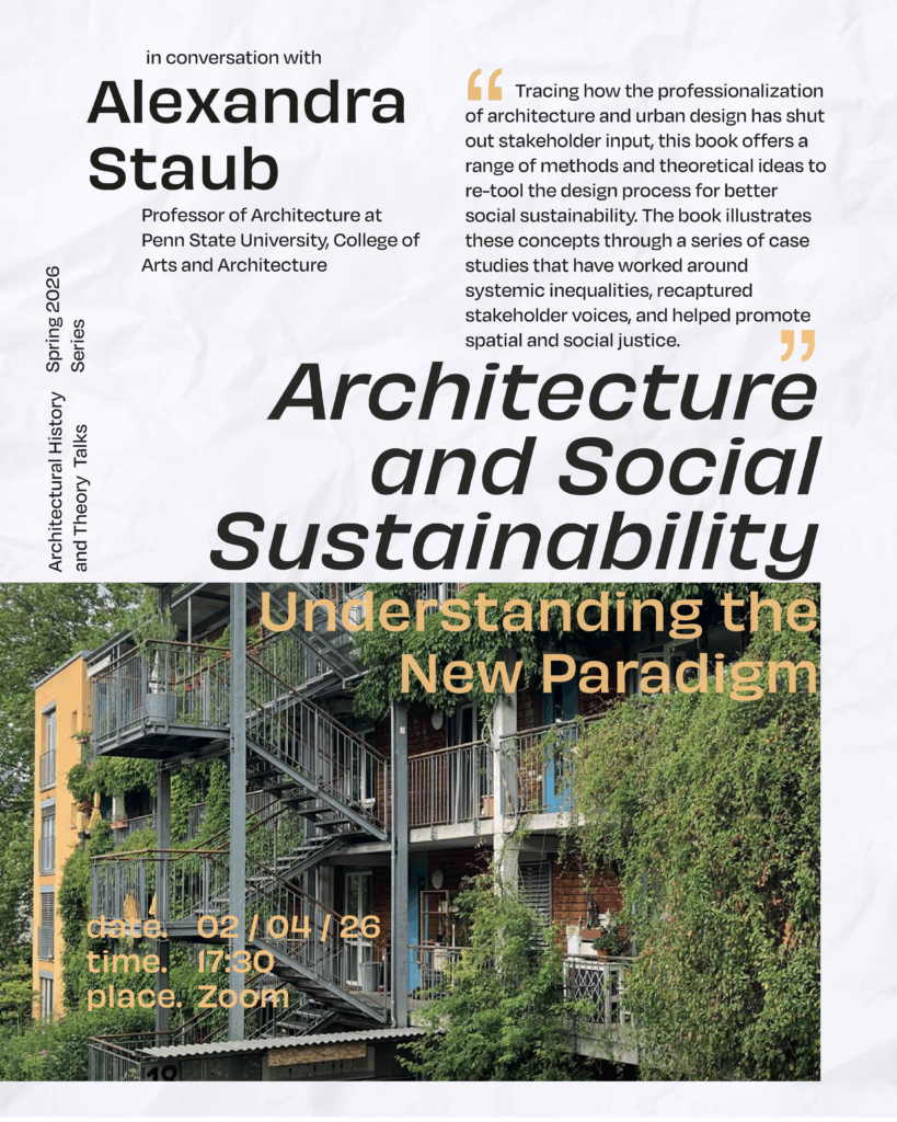 Tracing how the professionalization of architecture and urban design has often excluded stakeholder input, this talk presents a range of methods and theoretical approaches aimed at retooling the design process toward greater social sustainability. The presentation illustrates these ideas through a series of case studies addressing systemic inequalities, recapturing stakeholder voices, and promoting spatial and social justice. It argues for a renewed paradigm in which participatory practices and inclusive design processes become central to architectural thinking.